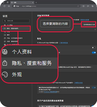 3. 进入[隐私权,搜寻与服务] 后,寻找[要清理的项目],再勾选Cookie与其他网站资料,之 后选择[立即清除]按钮。
