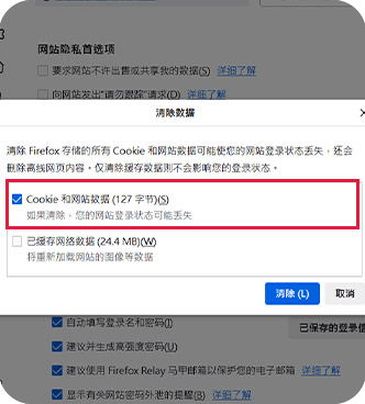 4. 勾选Cookie与网站资料,再点击[清除]按钮。